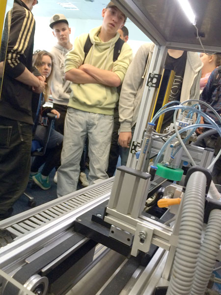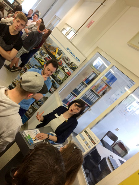 Sofort wurden wir von einem Auszubildenden empfangen und durch die Räume geführt. Es gab einen Roboter in Aktion zu sehen, außerdem die Werkshalle von Stadler, in der Züge gebaut werden. Anhand verschiedener selbstgebauter Maschinen konnten wir die Arbeit einer Reihe von Ausbildungsberufen kennenlernen - zum Beispiel aus den Bereichen Elektronik, Mechatronik oder Industriemechanik. Selbst ausprobieren durften wir unter anderem ein Gerät zum Sortieren von Metall und anderen Materialien. An jeder Station unseres Rundgangs konnten wir natürlich den Azubis und Mitarbeitern Fragen stellen.