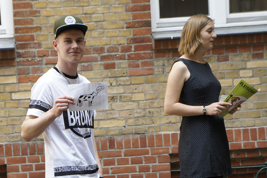 Ein weiteres Thema war Fleisch. Wir besprachen an einem Beispiel die Herstellung und die Folgen davon: Die Kuh Bonita (unser Beispiel) wird mit Soja gefüttert - für den Soja-Anbau wird der Regenwald abgeholzt. Außerdem werden die Sojapflanzen mit giftigen Pestiziden gespritzt. Dazu bekommt Bonita regelmäßig Antibiotika verabreicht - wir nehmen diese Antibiotika auf, wenn wir Bonitas Fleisch essen, dadurch werden Bakterien resistent gegen Antibiotika. Das heißt, dass wir, wenn wir krank sind, kein wirksames Mittel mehr gegen bestimmte Bakterien haben. Bonita schadet auch dem Klima: Sie scheidet Methangas aus (wenn sie pupst), was zur Folge hat, dass die Sonnenstrahlen zurück auf die Erde reflektiert werden. Dadurch wird die Erde erwärmt.