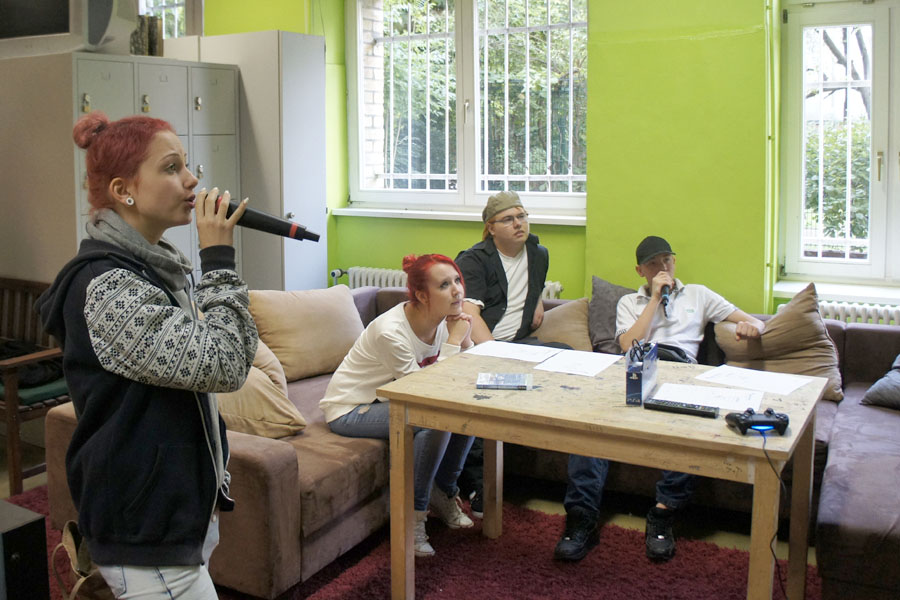 Die Singstar-Station bot uns die Gelegenheit, uns erst einmal warm zu singen, um danach einen Song auszuwählen, den wir nach ein paar Gesangsübungen gemeinsam singen wollten. Dabei wurden uns auch einige wichtige Grundlagen des Singens näher gebracht.