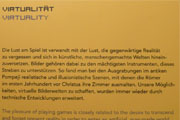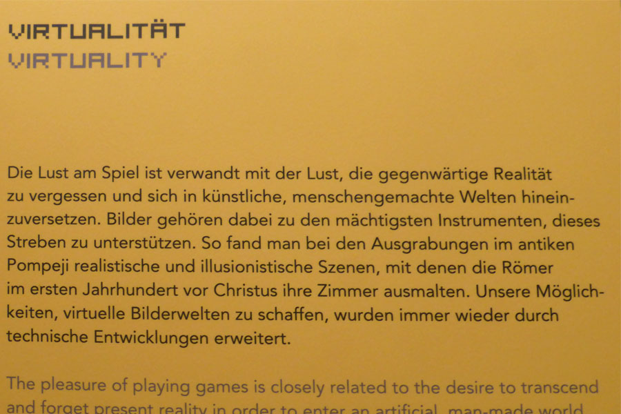 Eine Zeitreise zurück in eine vergnügte Jugend und in die virtuelle Welt der Gegenwart. Das Museum war voller Raritäten und Kuriositäten aus einer 50-jährigen Entwicklungsgeschichte der Games. Über 300 Exponate, rare Originale, spielbare Klassiker, interaktive Spielobjekte und Kunstinszenierungen lassen die Welt des spielenden Menschen im 20. und 21. Jahrhundert entstehen. Man konnte sehen, wie sich die Technik rund um das Thema virtuelle Spiele verändert hat.