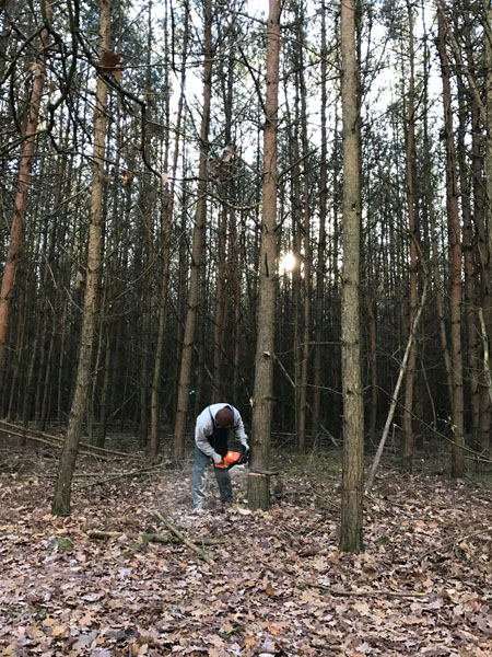 Bei herrlichem Sonnenschein, berührt von der Schönheit der Natur, fiel die Entscheidung auf eine riesige Kiefer. Nachdem der Baum gefällt wurde, zerlegten wir ihn mit Sägen, Astscheren und Macheten, um ihn für den Transport fertig zu machen. Während ein Teil unserer Gruppe Suppe erwärmte, wurden die Baumkrone, das Grün, gesammelte Zapfen und jede Menge weitere Bastelmaterialien aus der Natur für den nächsten Kreativtag in den Projektbus geladen.