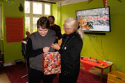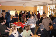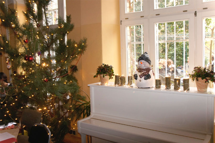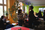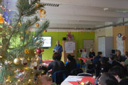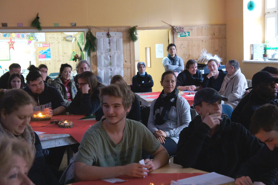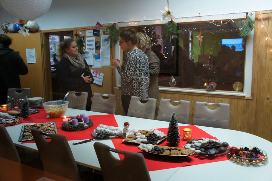Im Anschluss an den offiziellen Teil kam es dann bei Kaffee, Kuchen und selbstgebackenen Keksen in weihnachtlicher Atmosphäre zu zahlreichen kurzweiligen Gesprächen zwischen Eltern, BetreuerInnen, TeilnehmerInnen und MitarbeiterInnen. Im Hintergrund lief auf dem Fernseher ein musikalisch untermalter Fotorückblick der Veranstaltungen des zuendegehenden Jahres, der die vielfältigen Aktivitäten von Schule & Beruf noch einmal in Erinnerung rief.