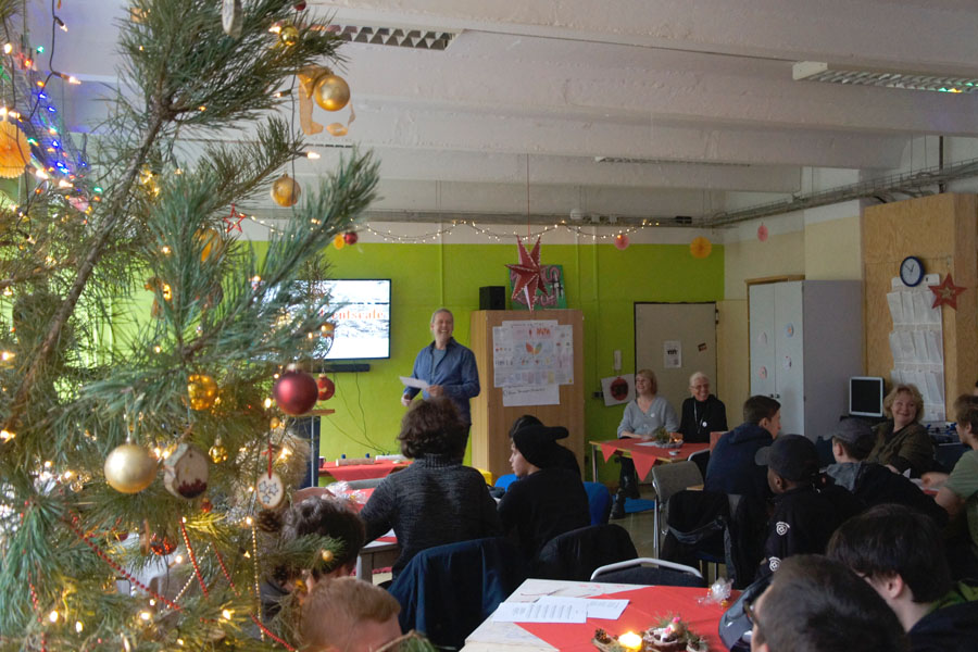 Ein letzter Höhepunkt im Jahr ist bei Schule & Beruf immer die Zeugnisvergabe sowie die Verleihung von Projektengeln an Jugendliche für besondere Mitarbeit und Kompetenzen, die in diesem Jahr wieder im Rahmen eines Adventscafés stattfand. Der Gruppenraum war festlich geschmückt und mit dem am letzten Kreativtag des Jahres gebastelten Weihnachtsschmuck dekoriert. Einen Weihnachtsbaum hatten wir - wie schon im Vorjahr - aus dem von uns bewirtschafteten Waldstück aus dem Oberkrämer Forst mitgebracht.