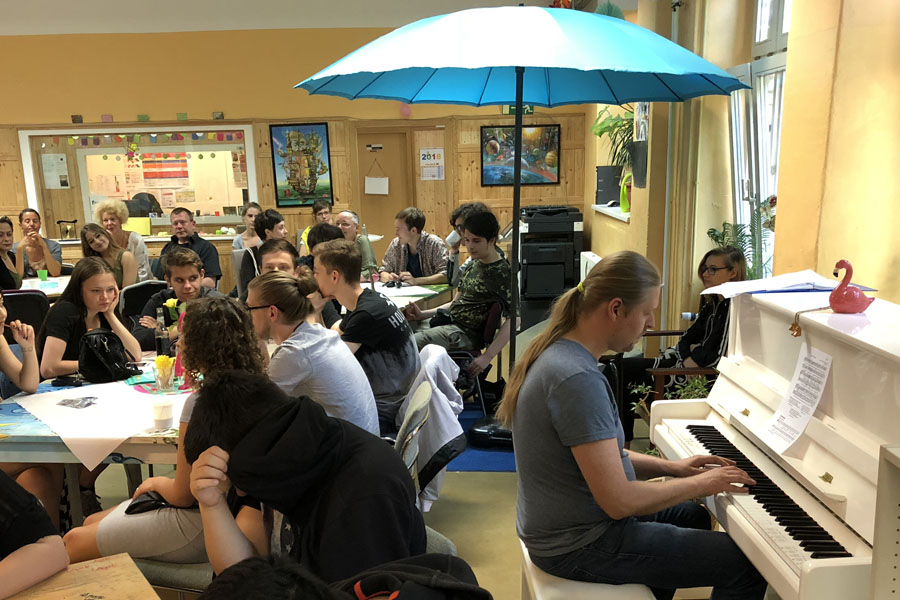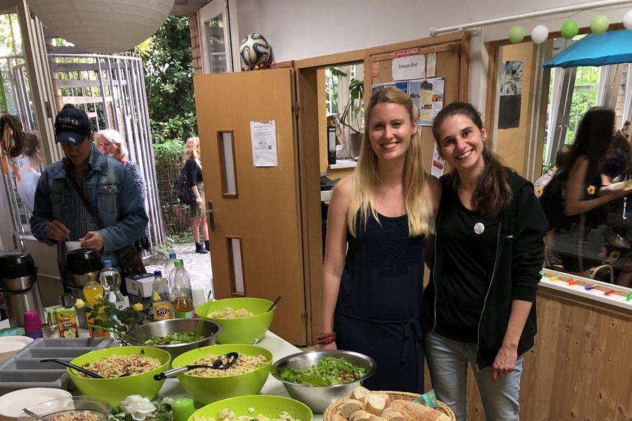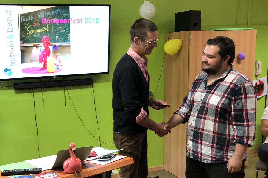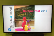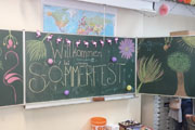 Das diesjährige Sommerfest bei Schule & Beruf am 28. Juni stand - in Vorahnung auf das in den folgenden Wochen eintretende Sommerwetter - unter dem Motto „tropisch“: Die Projekträume waren mit bunten Schirmen geschmückt, die Tische mit kleinen Flamingos, Ananas und Palmen dekoriert und die Kreidetafel wurde bereits im Vorfeld von einigen TeilnehmerInnen entsprechend bemalt.