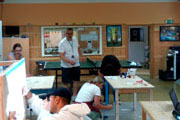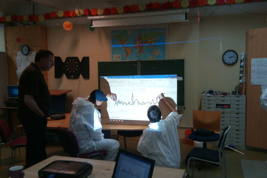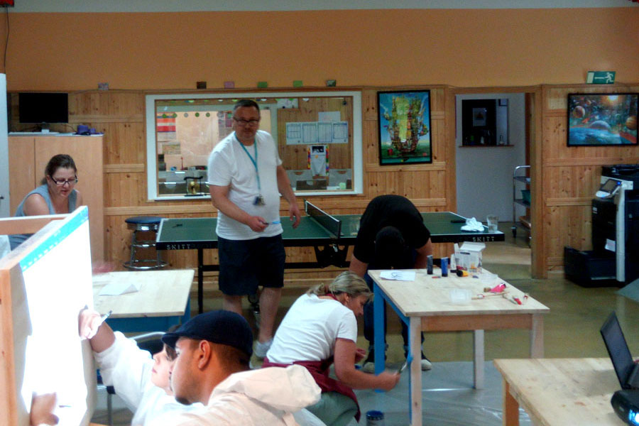 Wir haben zu Beginn die Tische mit Schleifmaschinen bearbeitet und die oberste Schicht abgetragen sowie mit Schmirgelpapier die Tischplatten bearbeitet. Anschließend haben wir den feinen Staub von den Tischen gefegt und haben Vorbereitungen getroffen, die Tischoberflächen neu zu gestalten. Jeder Projektteilnehmer hat danach Schutzkleidung erhalten und der Fußboden wurde mit einer Folie belegt. Danach begannen die Teilnehmer_Innen ihre Motive auf die Tische zu übertragen und zum Abschluss haben wir die Tischbeine mit einer hellblauen Farbe angestrichen.