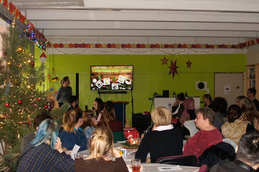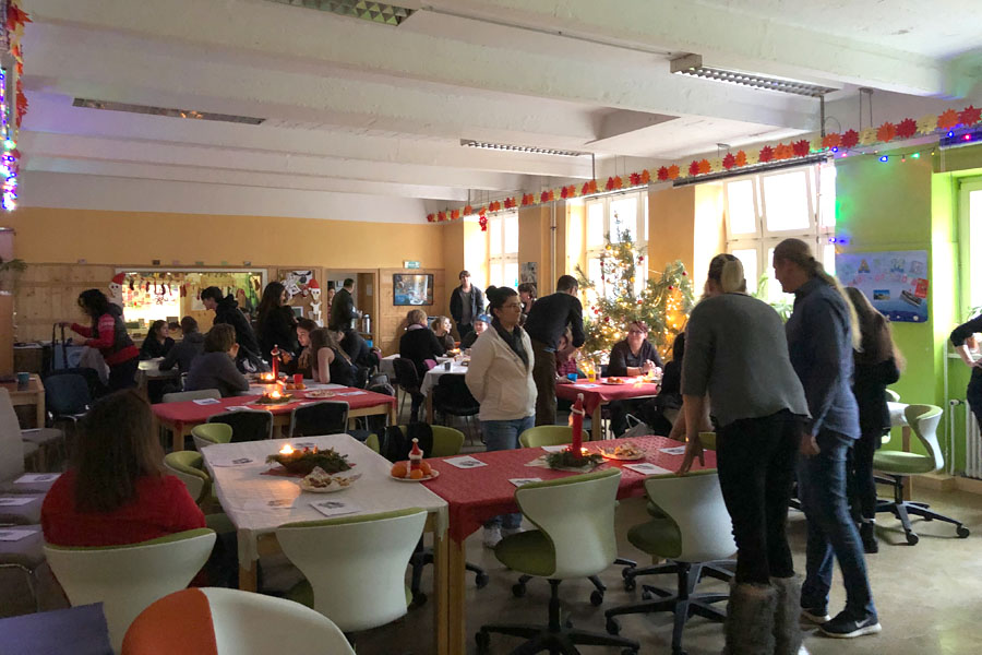 „Am 13.12.2018 haben wir unser Adventscafé veranstaltet. Ein paar Teilnehmerinnen und Teilnehmer haben ihre Eltern, Geschwister oder Betreuer mitgebracht. Die Stimmung war sehr ausgelassen und schön. Wir sangen Weihnachtslieder und Jenni erzählte uns eine Geschichte. Numcy hat uns durch Bilder einen Rückblick in das letzte halbe Jahr gewährt. Manche haben Kuchen oder ähnliches mitgebracht und wir haben auch im Projekt gebacken. Lange saßen wir noch in Gruppen und ließen uns das Essen schmecken. Es herrschte eine gemütliche, weihnachtliche Stimmung.“