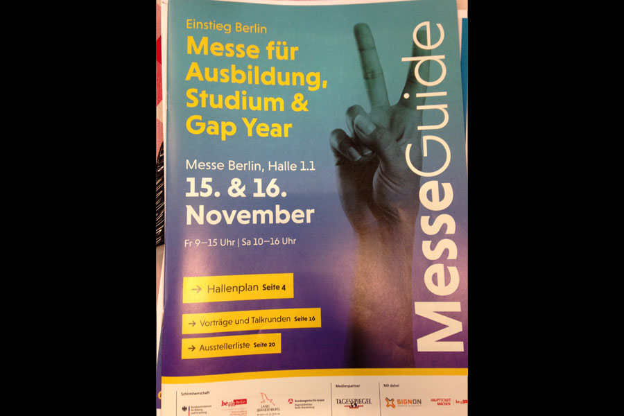 Am Freitag, dem 15. November begaben wir uns in einer Schar aus drei Bildungsbegleiter*innen und neun Teilnehmer*innen auf die Ausbildungs- und Studienmesse Einstieg Berlin auf dem Messegelände Süd. In selbstgewählten Gruppen erkundeten wir die Örtlichkeiten von 10 bis 13 Uhr.