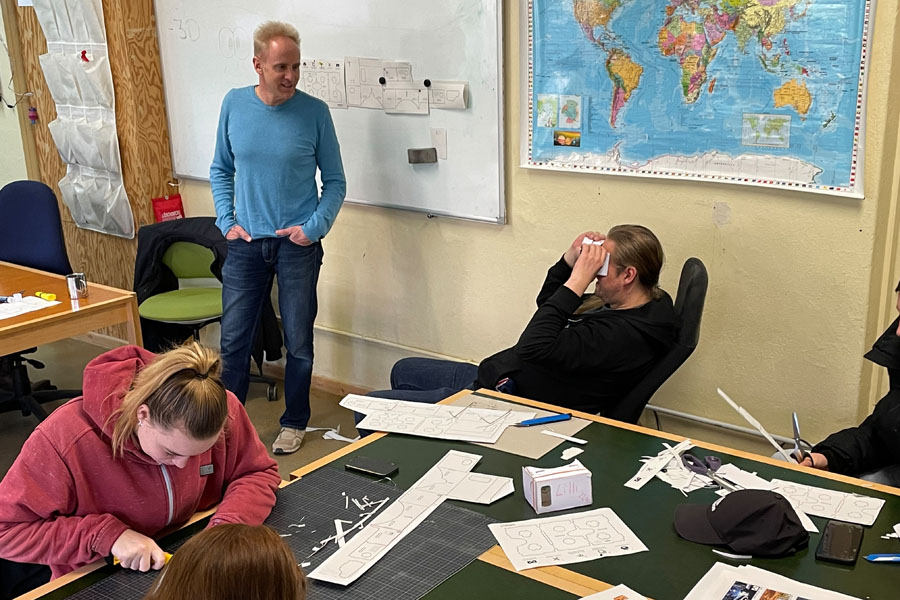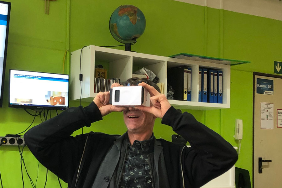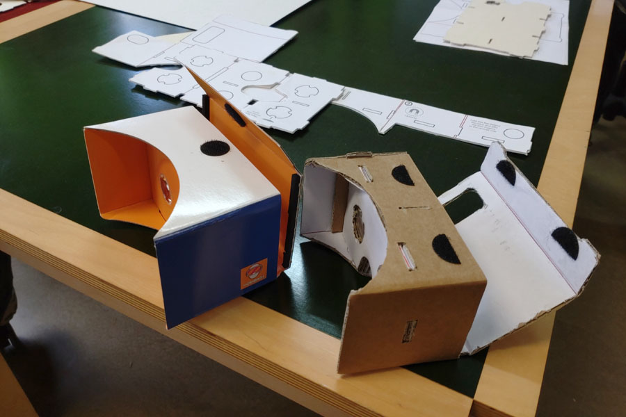An insgesamt zwei Vormittagen im Februar und März durften wir uns unsere eigenen VR-Brillen basteln. Das sind Pappbrillen, in die man sein Smartphone hineinlegen kann, um damit in 360°-Filme, virtuelle Räume und Anwendungen eintauchen zu können. So können wir zum Beispiel zukünftig Betriebsbesichtigungen durchführen, Orte auf der ganzen Welt in 3D erkunden und uns sogar auf der ISS umsehen, ohne eine mehrere hundert Euro teure VR-Brille von kommerziellen Anbietern kaufen zu müssen.