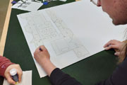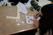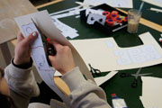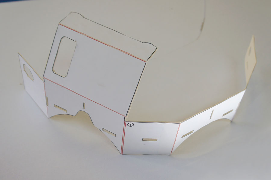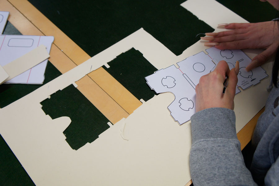 Zunächst haben wir im Internet frei verfügbare Schablonen ausgedruckt und auf Wellpappe geklebt. Dann ging es ans Ausschneiden. Für eine gut funktionierende Brille musste man sehr sorgfältig und ordentlich ausschneiden und die Pappe falten, damit die Linsen am Ende in der korrekten optischen Achse ausgerichtet sind und so räumliches Sehen ohne Doppelbild möglich wird.
