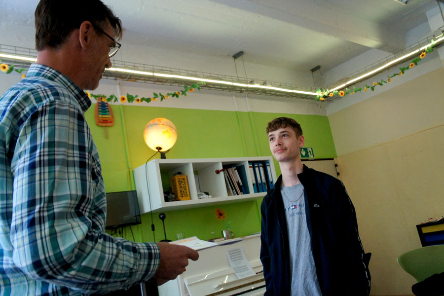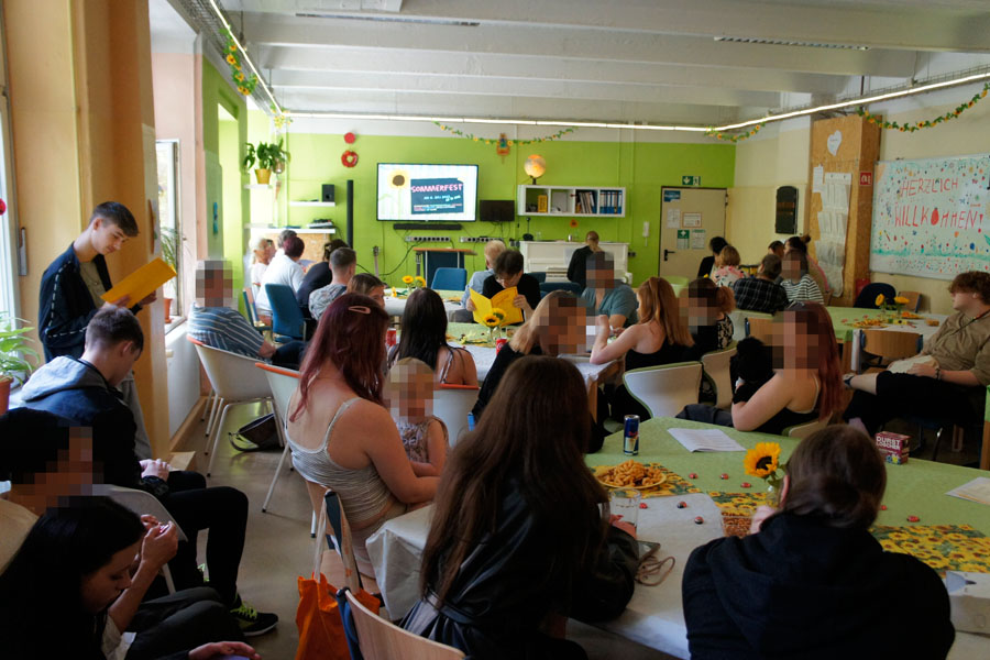 Für 10:00 Uhr war der Beginn der offiziellen Feier festgelegt. Es kamen mehr Gäste als erwartet - darunter mehr als 10 Ehemalige - und dann ging es auch schon kurz nach 10 los. Zuerst hörten alle die Klaviermusik zur Einstimmung, manche sangen hier schon mit: „Island in the sun“. Daraufhin folgte der Halbjahresrückblick mit Bildern. Nach einer weiteren Musikeinlage folgte dann schon die Zeugnisvergabe der Prüflinge. Es wurde sogar auch eine Rede von einem der Prüflinge gehalten, welche sehr berührend war und viele mitgenommen hatte, weil es für viele Prüflinge auch der letzte Tag im Projekt war. Bei jeder Zeugnisübergabe wurden auch persönliche Geschenke mit vergeben, auch für die Bildungsbegleiter war es sehr ergreifend. Es wurden während der Zeugnisübergabe auch schon die Grills angezündet, um es zeitlich anzupassen damit nach der Übergabe das Buffet direkt eröffnet werden konnte, wo das Wetter glücklicherweise auch mitgespielt hatte. Einige Elternteile haben sich auch daran beteiligt, Essen für alle mitzubringen.